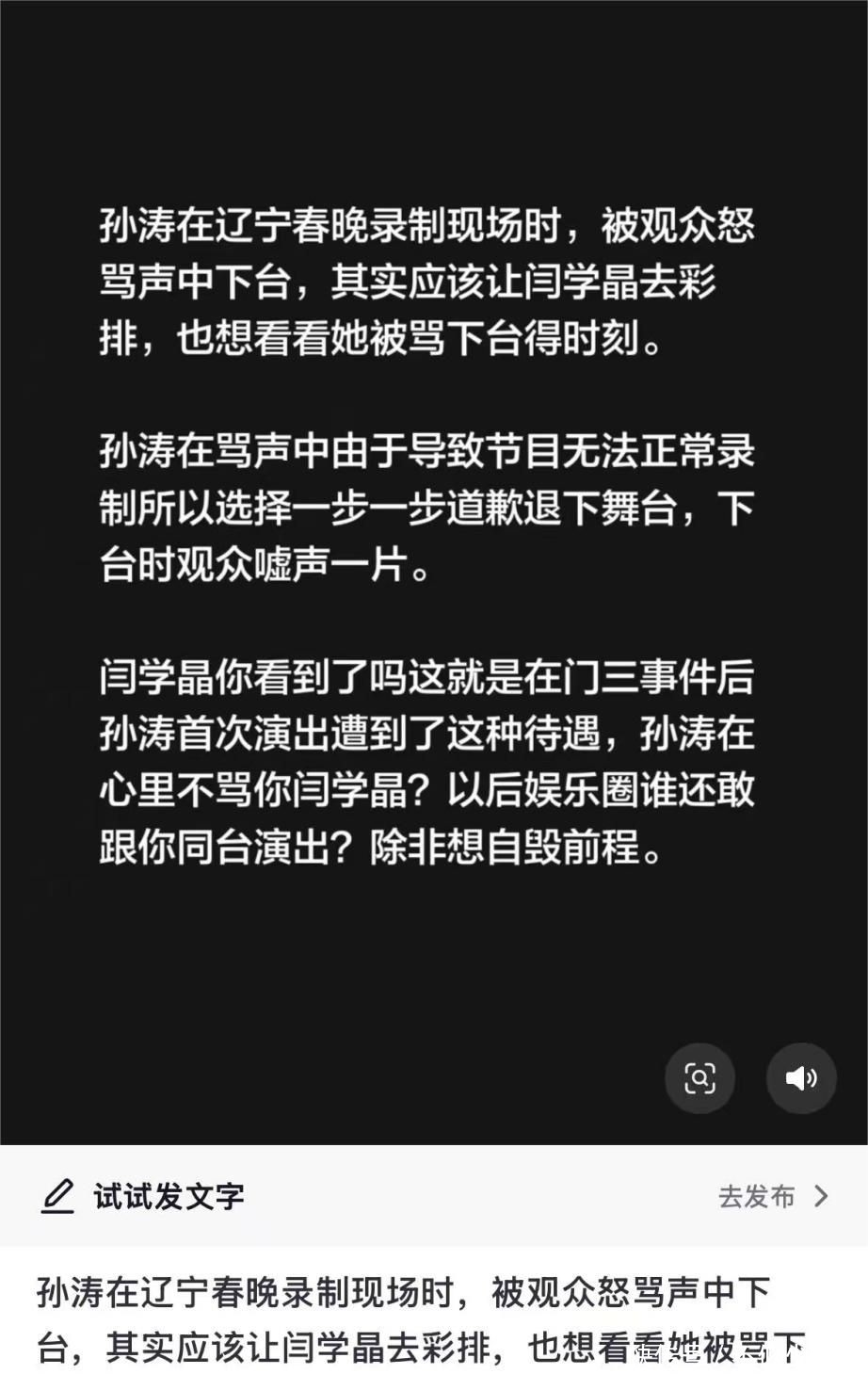 今晨更有博主爆料称,已在春晚彩排现场目击孙涛现身,疑似正在准备新节目。不过也有消息称,即便登台,也可能遭遇现场观众集体嘘声。